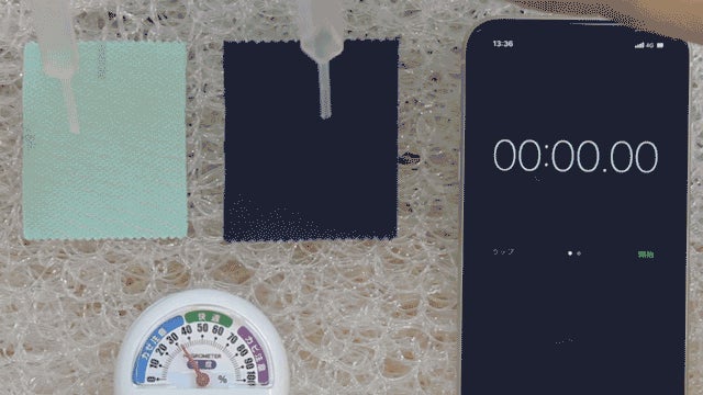 一般的な綿生地は水分を吸収した後は表面がジメッとするものもありますが、本製品生地はすぐに水分を吸収し、すぐにサラッとした感触に。