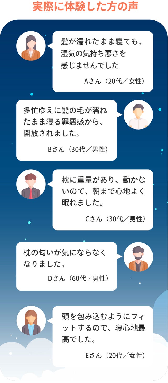 今回は「仕事が忙しくて髪を乾かさずに寝てしまいがち」「でも濡れた枕は雑菌が繁殖して肌荒れしそう」といった悩みを持つ方に使っていただける枕を、とプロジェクトを立ち上げました。