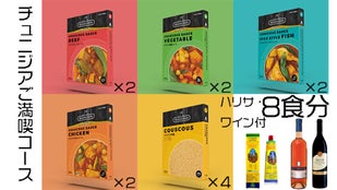 【内容】4種類のクスクスソースとクスクス中粒4箱 (8食分)、ハリサチューブ1本、チュニジアワイン2本