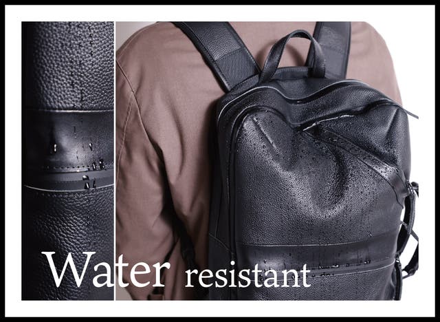 一般的にカウレザーは水に弱いですが、このカウレザーの撥水度はJIS L 1092 の試験結果、ボディーのシュリンクレザーは3級、付属のスムースレザーは4級、また耐水度は JIS L 1092 A法にて2000mm以上という結果となっており、撥水機能と耐水機能がありますので、一般的なレザーのバッグに比べて水に強いです。また、全面止水ファスナーを使用しました。