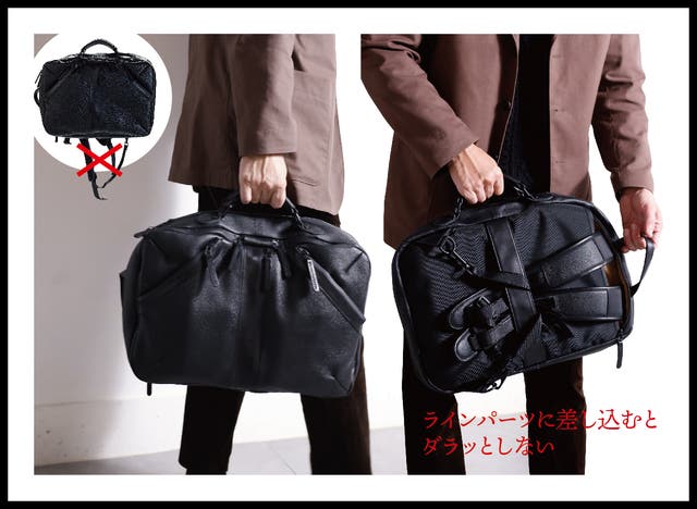 後ろ面のレザーのラインパーツに差し込むことでダラッと垂れずにスッキリ持つことができます。