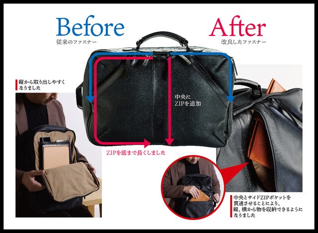 今回はさらに使いやすい仕様にならないか?と研究を重ね、リュックで持った時、手持ちの時、ポケットの構造を見直し、縦からでも横からでもスムーズに物の出し入れができるように、改良いたしました。
