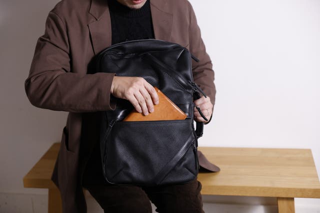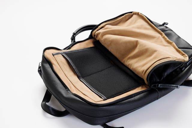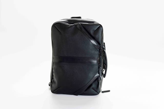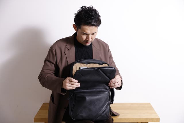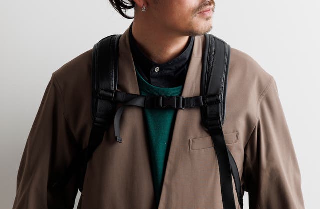 前回のバッグに比べ、マチを約5cm小さくし、一般的なリュックのサイズに近づけました。また、全面レザーから後面を高密度ポリエステル素材を使い軽くなりました。