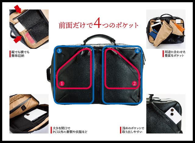前面に4つのポケットがあり、①②の斜めのポケットは浅めのポケットで、スマホなど、頻度に使うものを収納できます。③④のポケットは大きい設計でガジェット系や手帳など、左右にいろいろ収納できます。