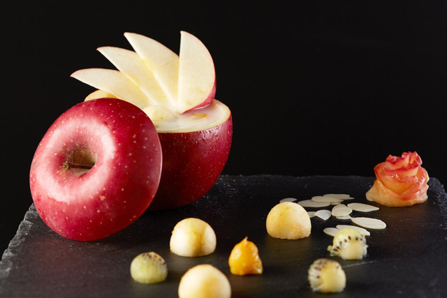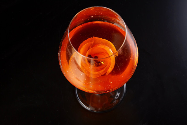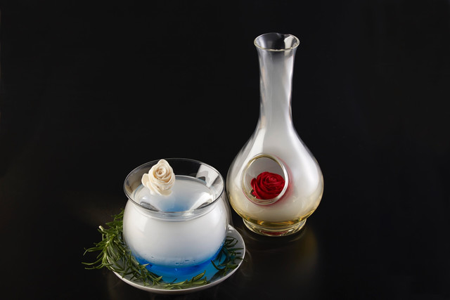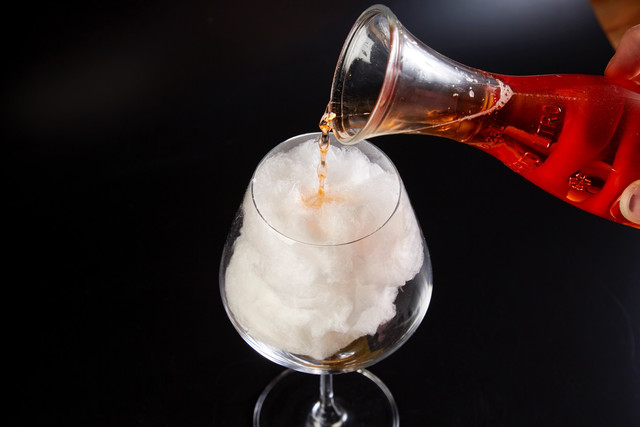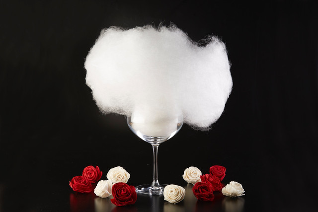 グラスにモクモクと盛り付けられた綿あめの上からお酒を注ぐと、綿あめが一瞬で"溶ける”カクテルです。綿あめが溶けると、グラスの中に潜んでいたリンゴがバラが咲くようにゆっくりと花開きます。