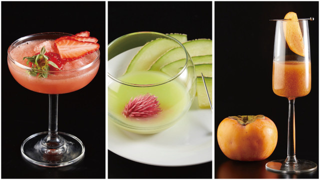 (左から「ふんだんにイチゴを使ったレオナルド」「メロンと日本酒の出会い方」「カキに溺れる」)