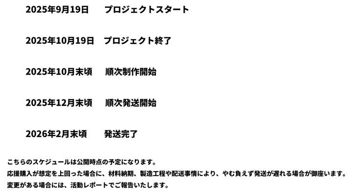このプロジェクトはAll in型です。目標金額の達成に関わらず、プロジェクト終了日の2025年10月19日までに支払いを完了した時点で購入が成立します。
