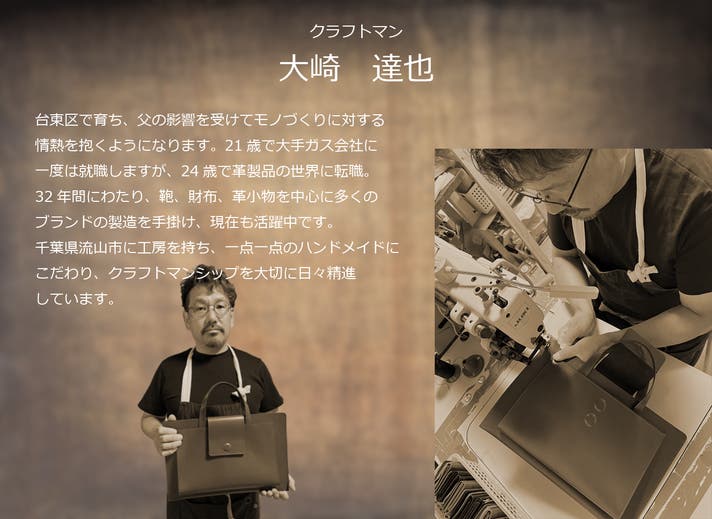 今回のバッグの製造は30年以上にわたって革製品の製造に携わってきたクラフトマン、大崎達也です。