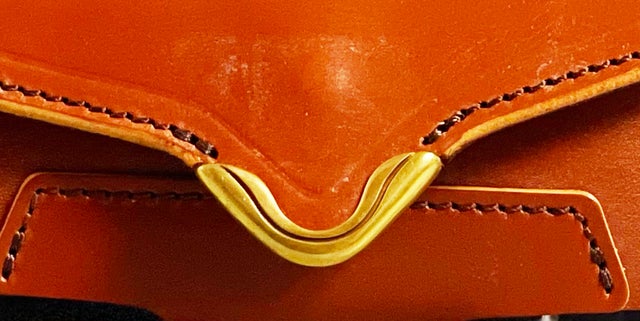メインフラップには、機能性と装飾を兼ね備えたオリジナルデザインの真鍮製 コバ補強金具を配しました。適度な硬さがあり、ホックとの距離を取ることでテコの原理が働き、スムーズな開閉を実現しています。