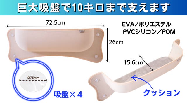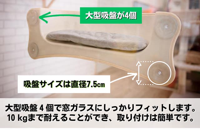 - 大型吸盤4個が猫とベッドをしっかり支えます。実行者が飼っている10kgの猫が使用中です。