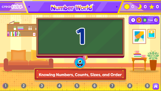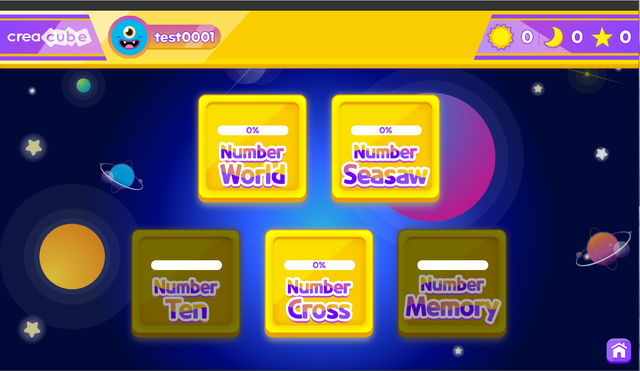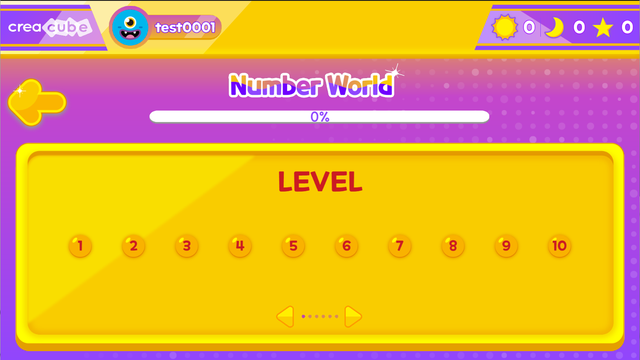 足し算、引き算、掛け算、割り算、九九、自由に出題できる問題’まで計6つのステージのクリアを目指します。