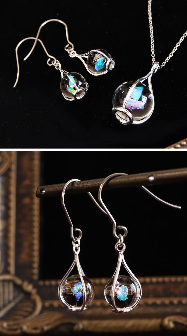 透明なガラスの球体の中に浮かぶオパールが光を反射してオーロラのように輝き、水の惑星「地球」を思わせるような清々しい美しさに満ちています。