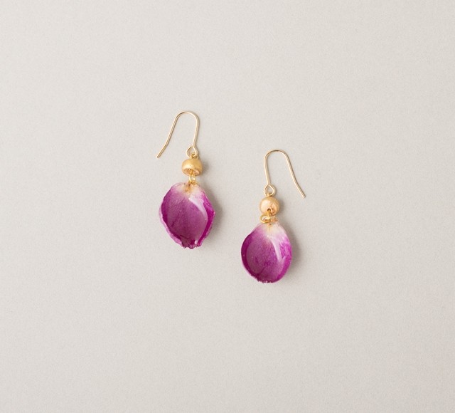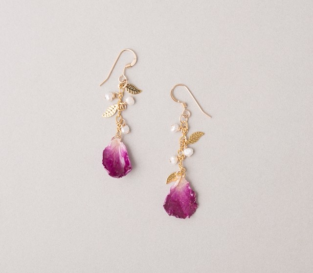 樹脂で加工した本物のバラを使用しております。ピアスもしくはイヤリングの2種類からお選びいただけます。