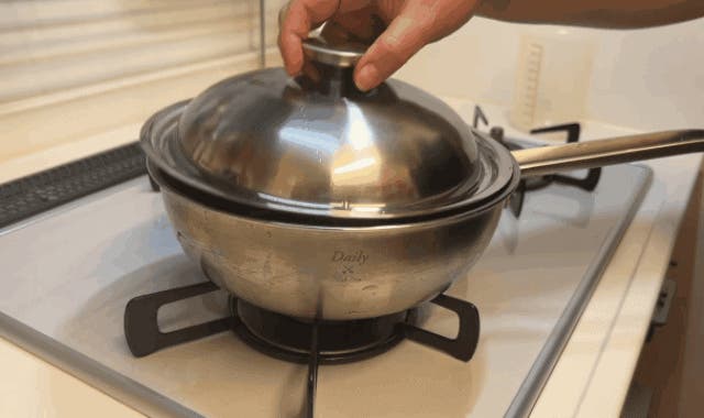 お米を中華鍋でそのまま洗って同量の水に15分くらい浸します。中火の弱火でハイドームカバーをして炊き始め蒸気と多少のふきこぼれが始まったら弱火。パチパチ音がしたら少し我慢して火を止め10分ほど蒸らして完成です。