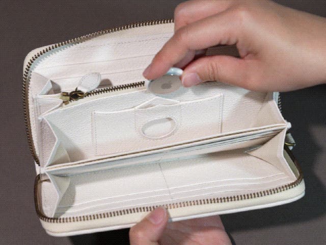 A3: 本製品にはApple純正のAirTag専用のポケットが作られており、電池絶縁シートを引き抜いた後、そこに入れるだけで財布側は安全に機能します。傷や変形、動作不良の原因となる小銭入れに入れるようなことをせず、万が一の紛失時にもiPhoneの「探す」アプリから財布の位置を特定することができます。AirTagのセットアップは非常に簡単で、どなたでもすぐにご利用いただけます。