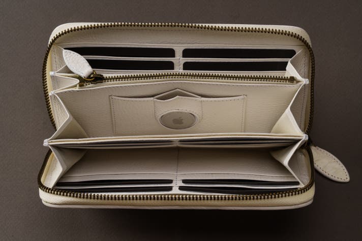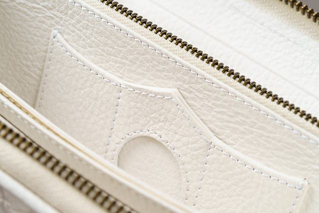AirTagの格納スロット部と外側に施された手縫いステッチとがデザイン美と脱落しないホールド性を両立し、財布のセキュリティ性という概念と、それをサポートする新機能をひとつにしました。