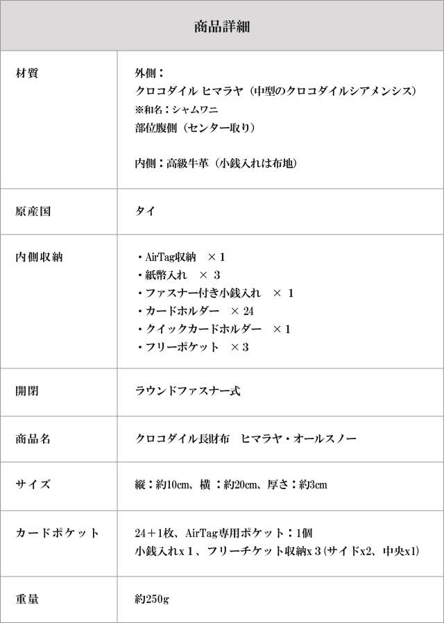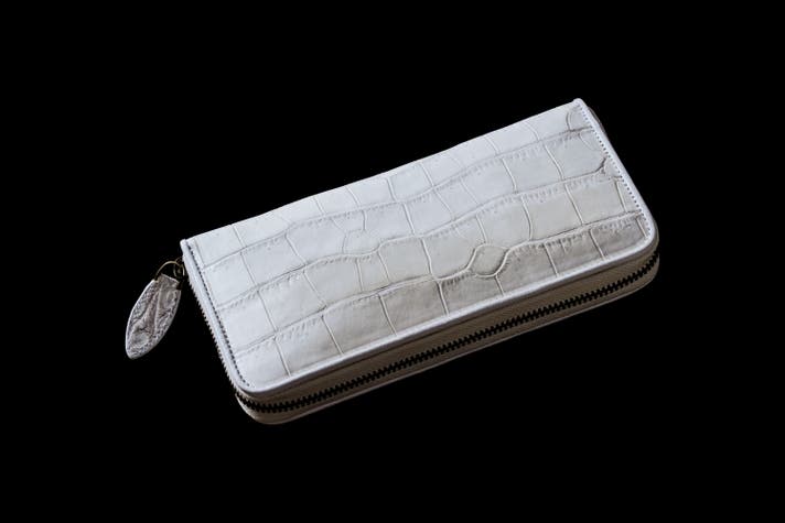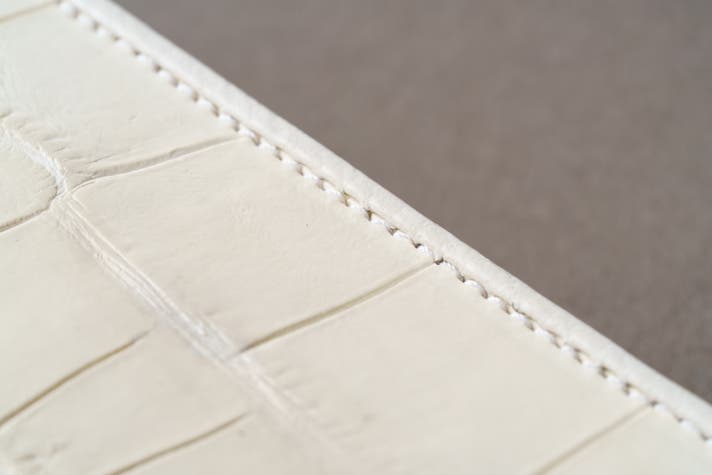 なお、このオールスノーは通常のヒマラヤクロコダイルとは異なり、両サイドの斑点模様がありません。白色塗装の一般的なワニ革とは異なる無着色仕上げ。革本来の上質感と洗練されたイメージを纏う。あなたと共に時を重ね、経年変化を楽しめる本物の上質です。