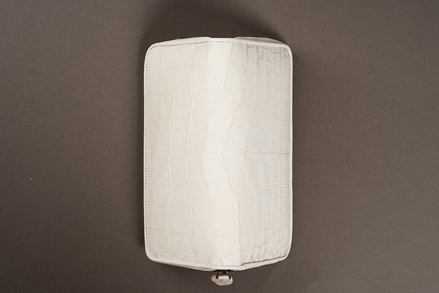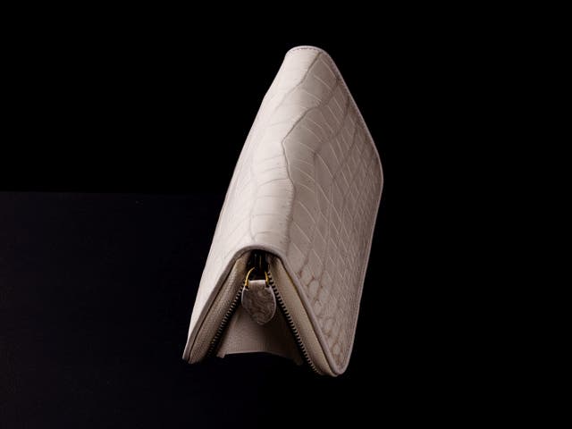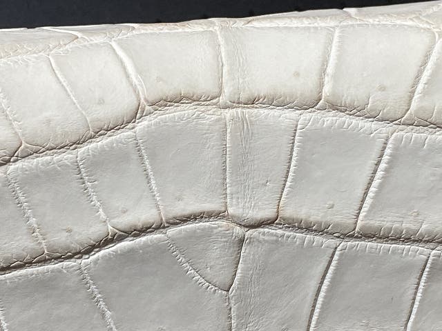 A2: 本製品では、大人気のヒマラヤクロコダイルの中でも極めて特別な「全面が白色」で取れる中型のクロコダイルを使用しております。ヒマラヤの特徴である斑点模様が財布の両サイドにかからず、白い部分だけで作られております。「白い部位だけ」で全面を取れるくらい大きく、傷なく、大切に育てた個体でなくては作れません。