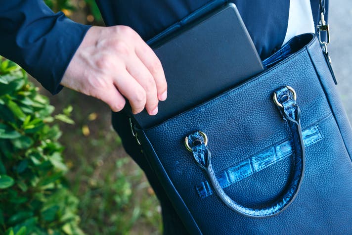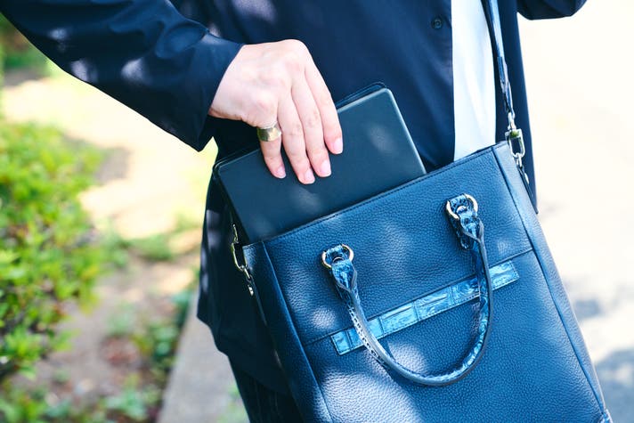 - タブレットや書類もすっきり収まる、スマート設計の縦型トート