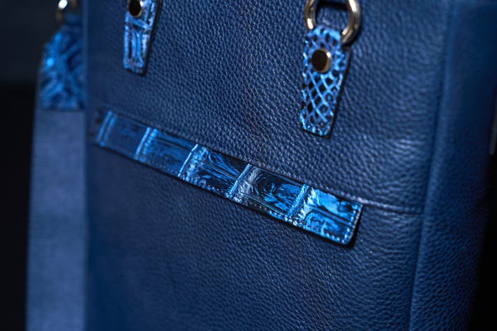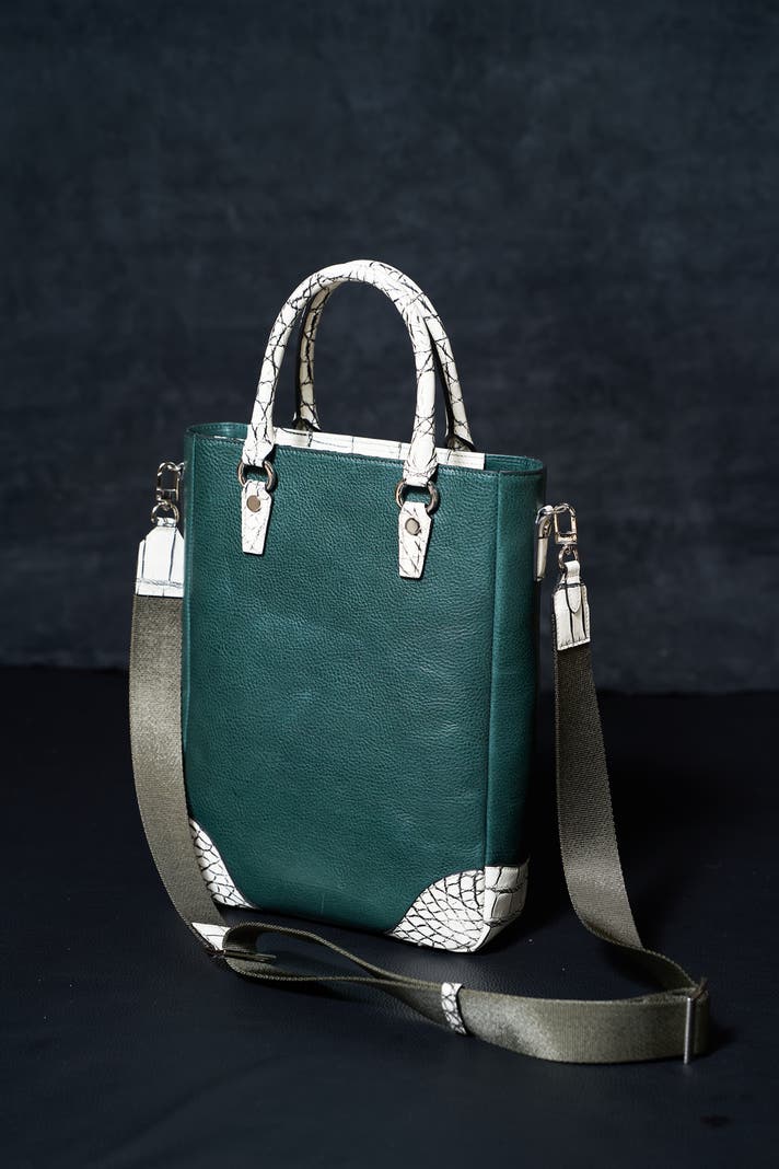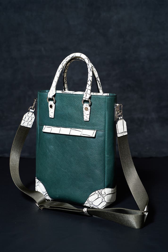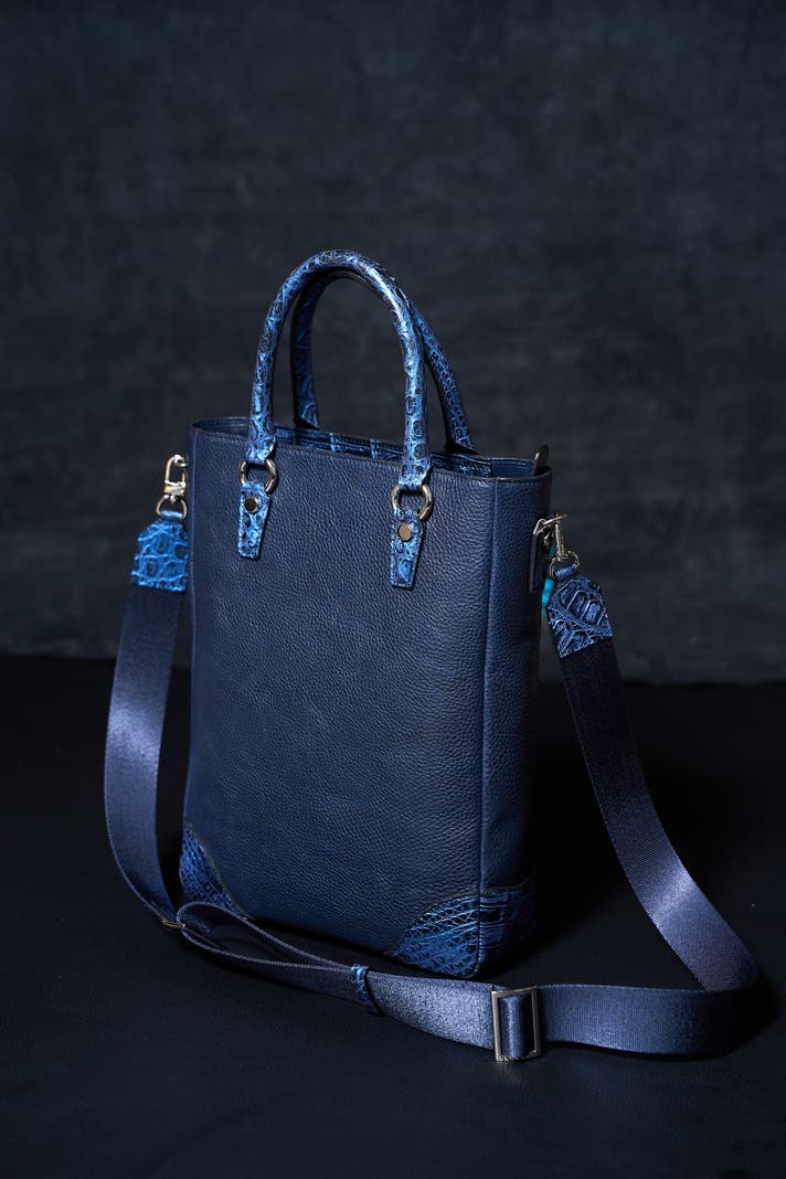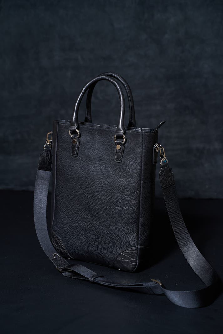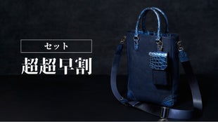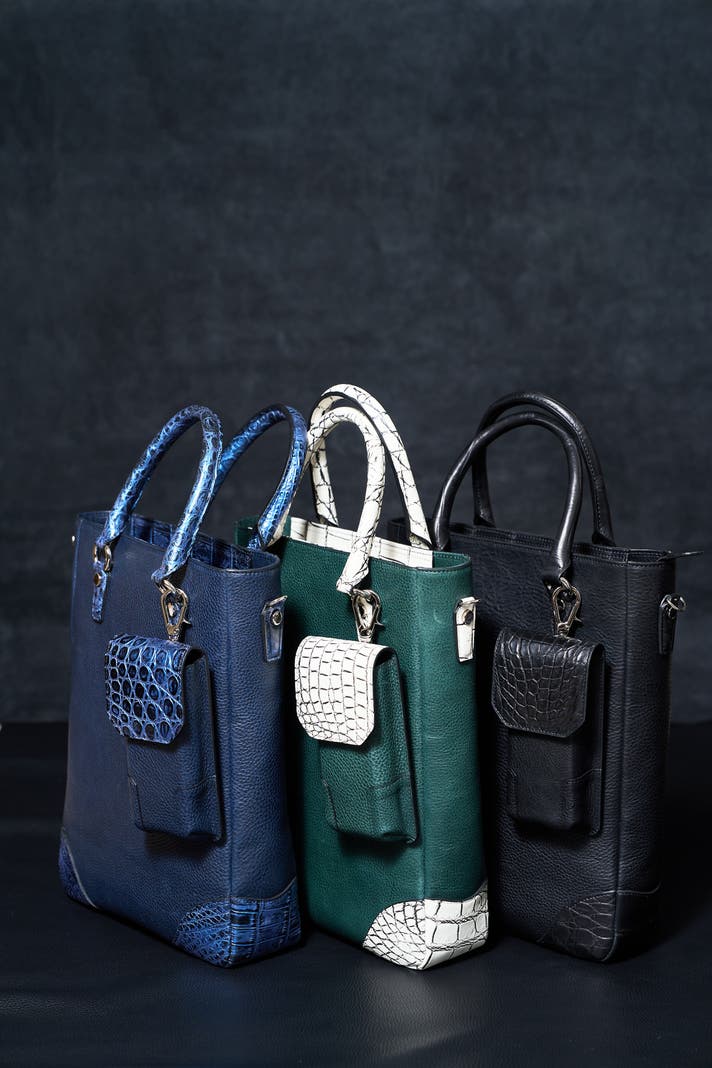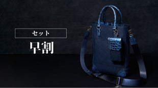 そんな希少なラージクロコダイルと、イタリア製ヌメ革を組み合わせ、ビジネスから日常まで幅広く活躍するデザインに仕立てました。タブレットや書類をすっきりと収納できる縦型トートと、統一感ある専用メガネケースがセットになったこの逸品は、品格と実用性を兼ね備えた新たなパートナーとなるでしょう。