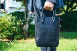 縦型トートは、スリムな外観ながらタブレットや書類、財布などを整理して収納できる大容量設計。中には仕切りや複数のポケットを備え、荷物の出し入れがスムーズです。ファスナー付きで中身をしっかり守りつつ、開けたままでも使える2WAY仕様。