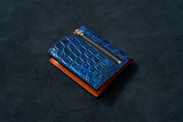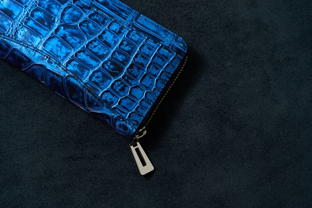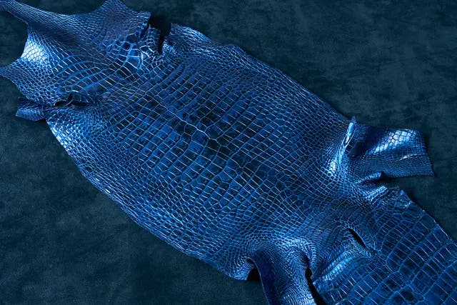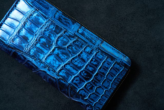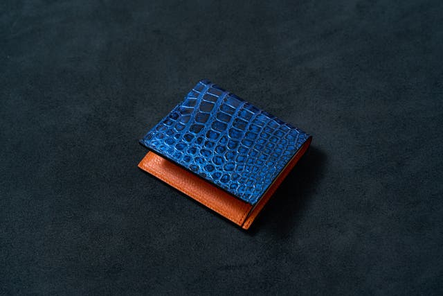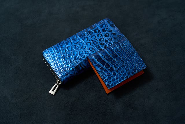 ※上写真は染色後のワニ革になり、本製品のミッドナイトブルー色の1枚革です