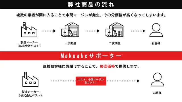 製造元である㈱ベストが直接お客様へ配送し、中間マージンを削減しました。この流通形態が出来たことにより、圧倒的なコストパフォーマンスを実現しています。