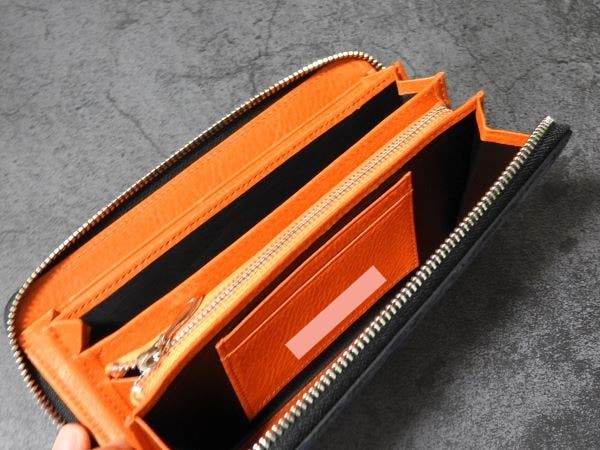 内部には、12箇所のカードポケット、大きく開くファスナー付きの小銭入れが中央に配置され、さらにマチ付きの収納スペースが3箇所(お札やレシートなどを収納可能)、そしてメインカード収納の裏側にフリースペースが2箇所設けられています。