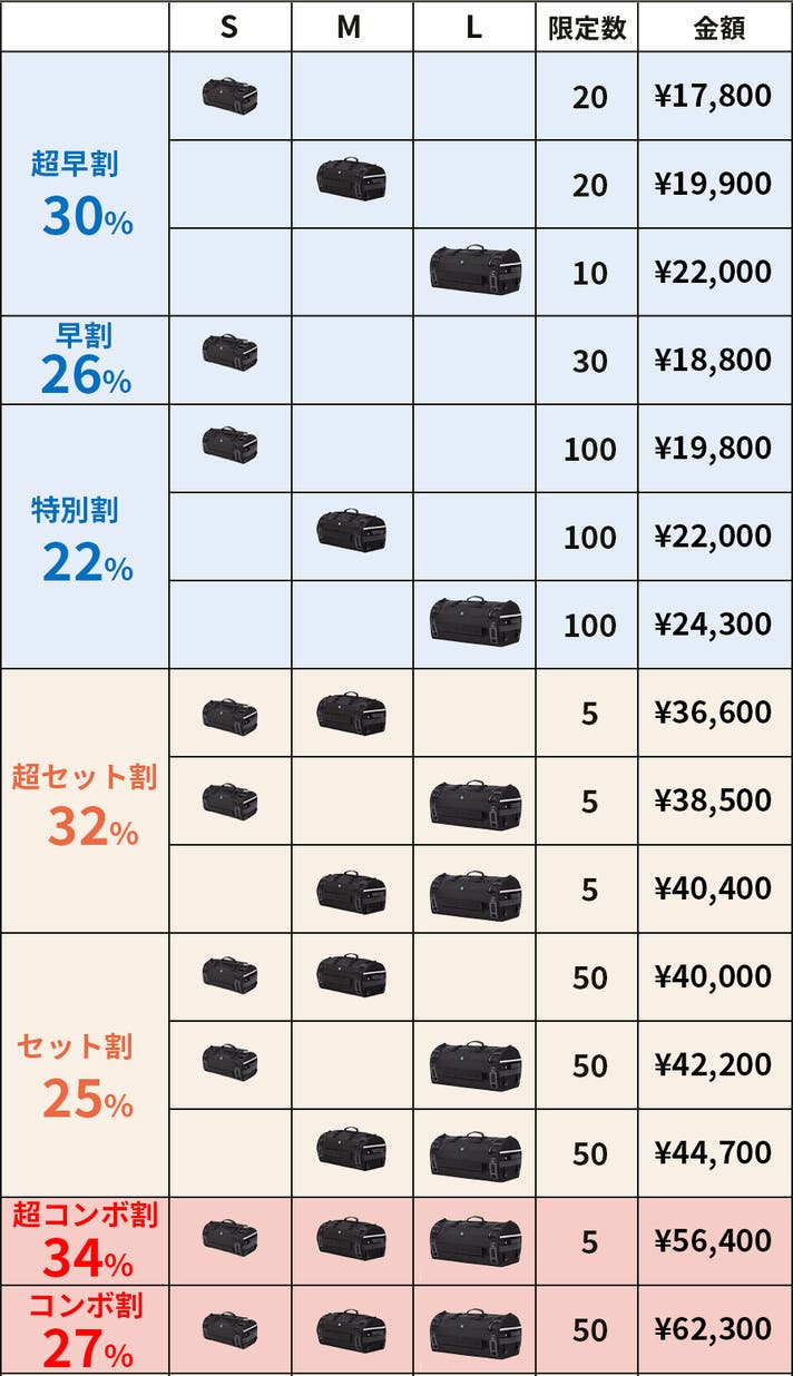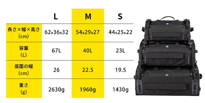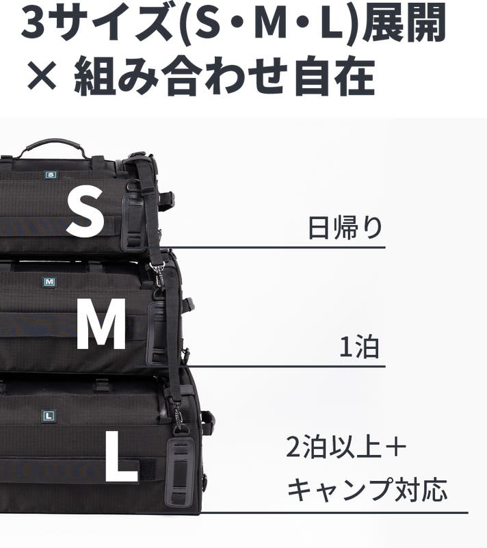 A.Sが23L、Mが40L、Lが67Lの収納力があります。「日帰り=S、1泊=M、2泊以上=L」が目安で用途に応じて最適なサイズを選べます。複数サイズを組み合わせて使うことで、さらに大容量にも対応可能です。