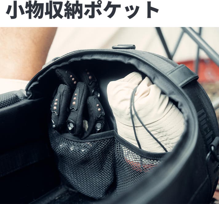外装にはモールシステムやDリングも備え、カラビナやギアの追加装着が可能。バイク旅ならではの実用性と遊び心をプラスします。