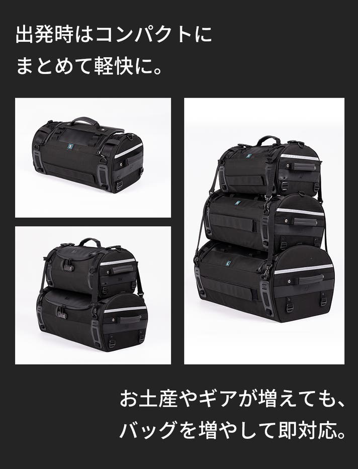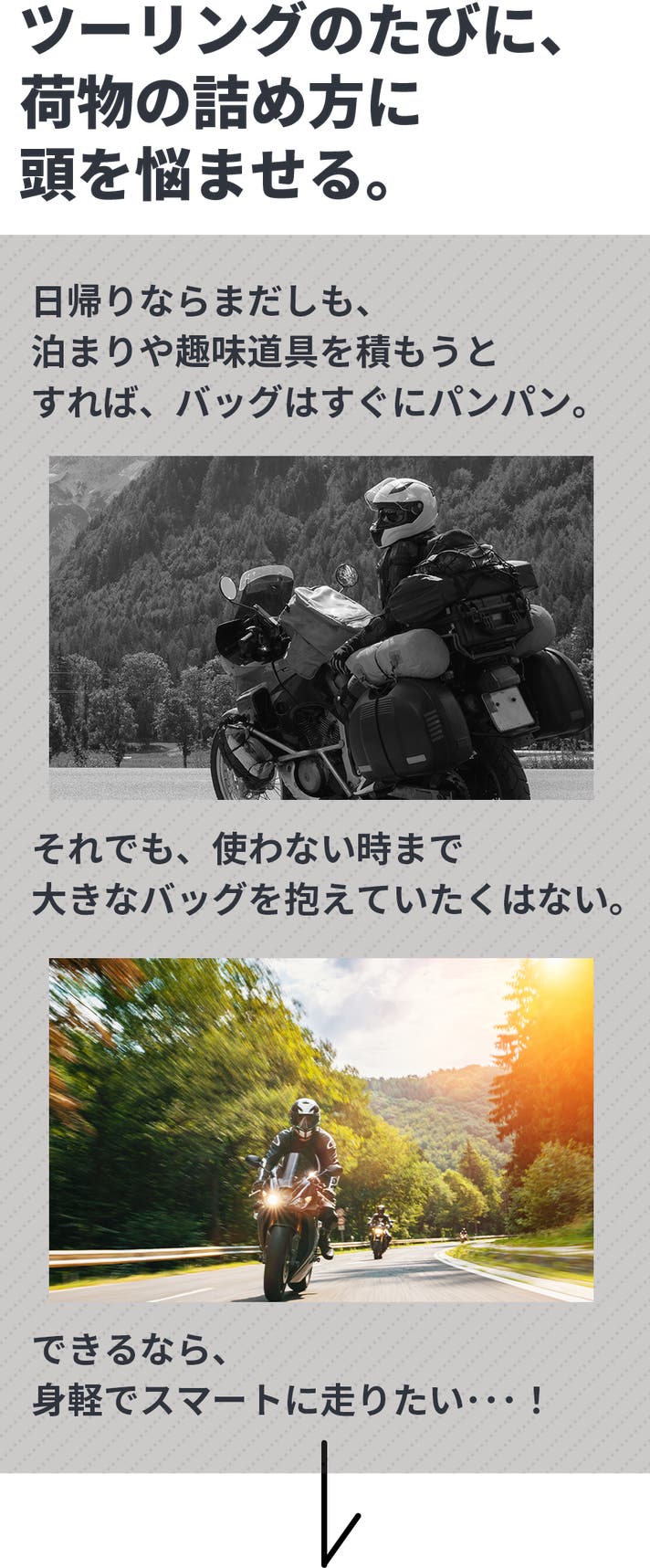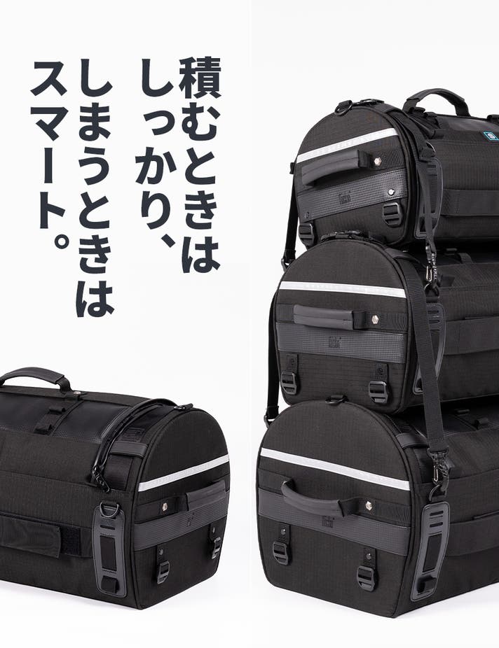 使わないバッグは中にスッと収納。保管もスマートに。ガレージでもかさばらず、準備も片付けもラクラク。あなたのツーリングスタイルにぴったりの容量を。