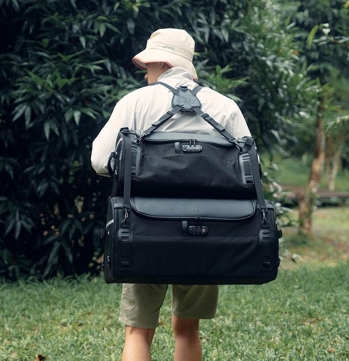 肩掛けストラップ標準装備+オプションのX型ストラップでリュックスタイルにも対応。重さを分散するX字設計で、3個重ねても背負いやすい。長時間の移動も快適な設計です。
