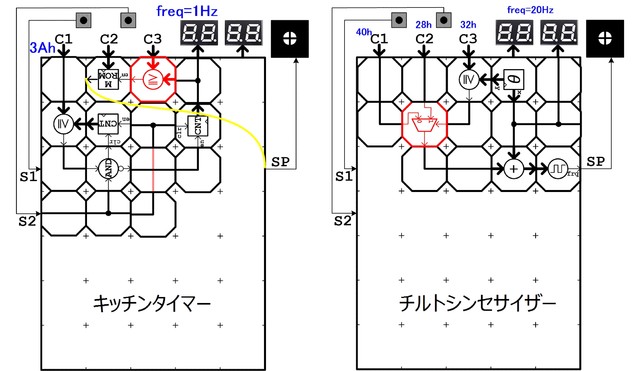 左側がキッチンタイマーの実装例です。赤色は裏面に装着したブロックを示しています。黄色線はジャンパ線で接続ブロックでどうしても配線できない場合に用います。定数値C3に設定した時間(分)が経過するとメロディーが鳴ります。メロディの種類は定数値C2で指定します。押しボタンS2でリセットします。右側はチルトシンセサイザーの実装例で、スピーカーからボードのx方向の傾きに応じた音程の音が鳴ります。y方向に傾けると1オクターブ高い音となります。