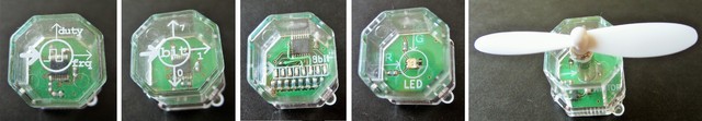 左からPWM、bit抽出、2進変換、LED、モータブロックです。PWMブロックは入力信号に応じた周波数パルスとデューティーパルスを出力します。bit抽出ブロックは入力信号(8bit幅)の第0,1,7bitをレベル信号として出力します。2進変換ブロックは入力を2進変換して各bitに対応した8個のLEDが光ります。LEDブロックは赤/緑の2色LEDを搭載しています。