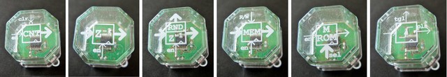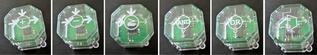 パッドは⑦電源、⑧GND、⑨CLKが同心円状に配置されているのでブロックは4方向(0°、90°、180°、270°)に自由に固定することができます。また、隣接する4ブロックの入出力信号が⑩~⑬パッドを通して接続されるので複数ブロックを有機的につなげることができます。
