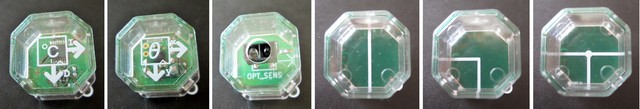 左から温度センサ、傾きセンサ、光センサ、そして3タイプの接続ブロックです。温度センサは12bit精度、傾きセンサは水平面からの傾きを2軸方向でそれぞれ出力します。光センサは赤外線の発光部と受光部をもったフォトリフレクタを実装しています。