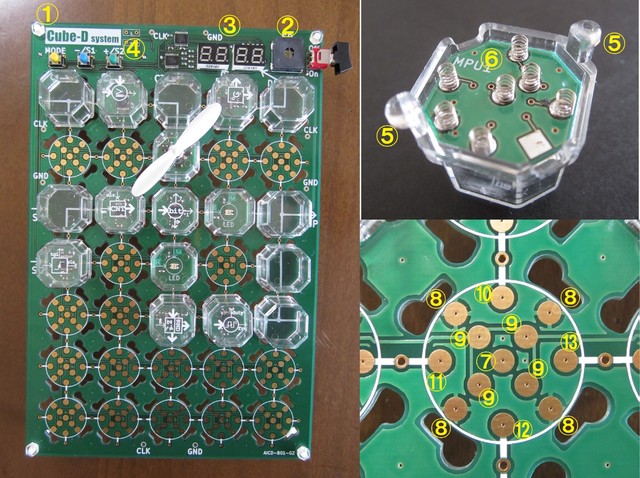 ①ベースボードには②スピーカ、③2桁数値表示器、④押しボタンSWが実装されています。⑤ブロックの固定脚をベースボードに挿入後20度回転でベースボードに固定できます(取り外しは逆回転)。⑥ブロック裏面の接点バネと⑦~⑬のベースボードの金メッキパッドが接触して電気的に導通することで、ベースボードからブロックに電源、GNDとクロック信号が供給されます。