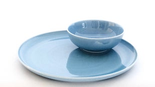 朝はトースト、サラダ、ヨーグルトでワンプレートに。夜はプレートはメインに、ボウルには副菜を。一緒でも別々でも使い勝手の良い2点セットです。明るいブルーで、食卓を明るく彩ります。
