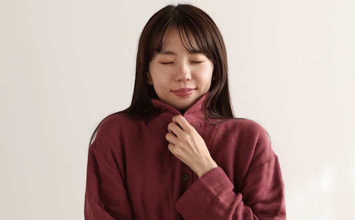 首元までしっかり覆って冷気の侵入を防ぎます。襟を立てればさらに暖かく。