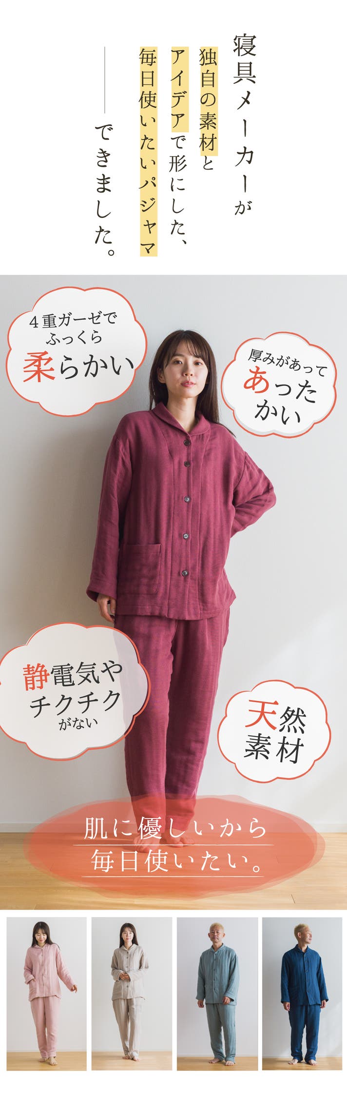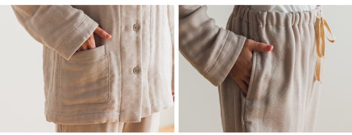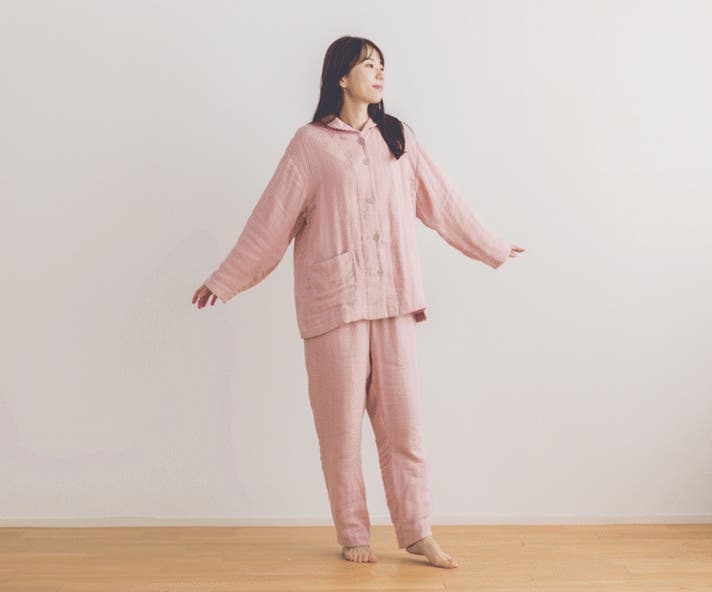 日本伝統の製法でじっくりと時間をかけて仕上げたガーゼを、優しく重なるように4重に織り上げることで、ふっくらとした柔らかなガーゼパジャマができました。