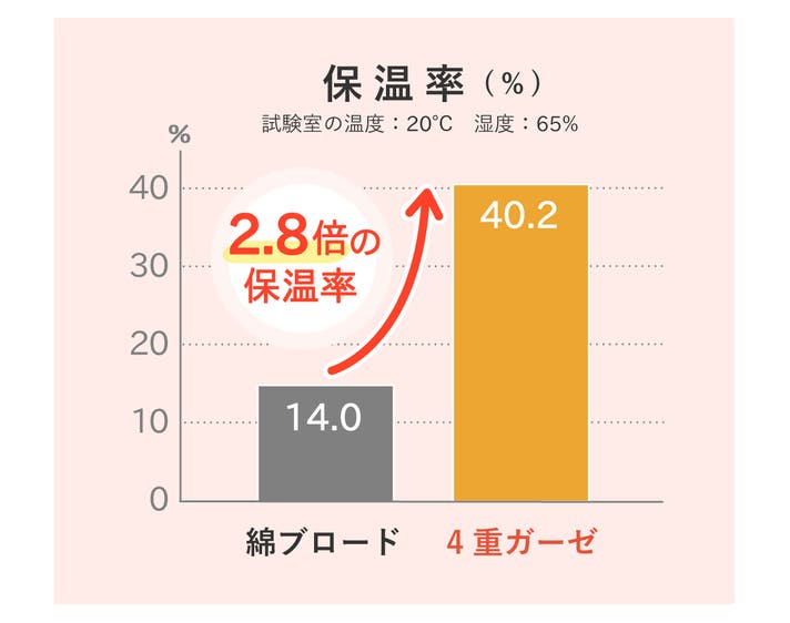 寝具で一般的に使われる綿ブロード生地と比較して、4重ガーゼは約2.8倍もの保温率です。