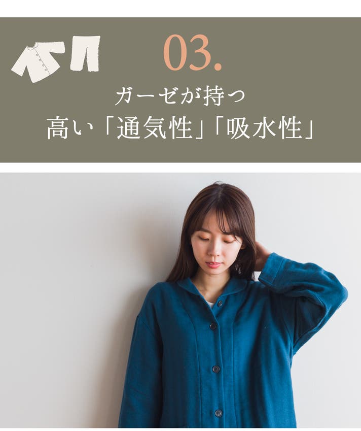ガーゼは医療の現場でも使われるほど通気性・吸水性が高い。クムコのパジャマはそんなガーゼ生地を4枚も重ねています。