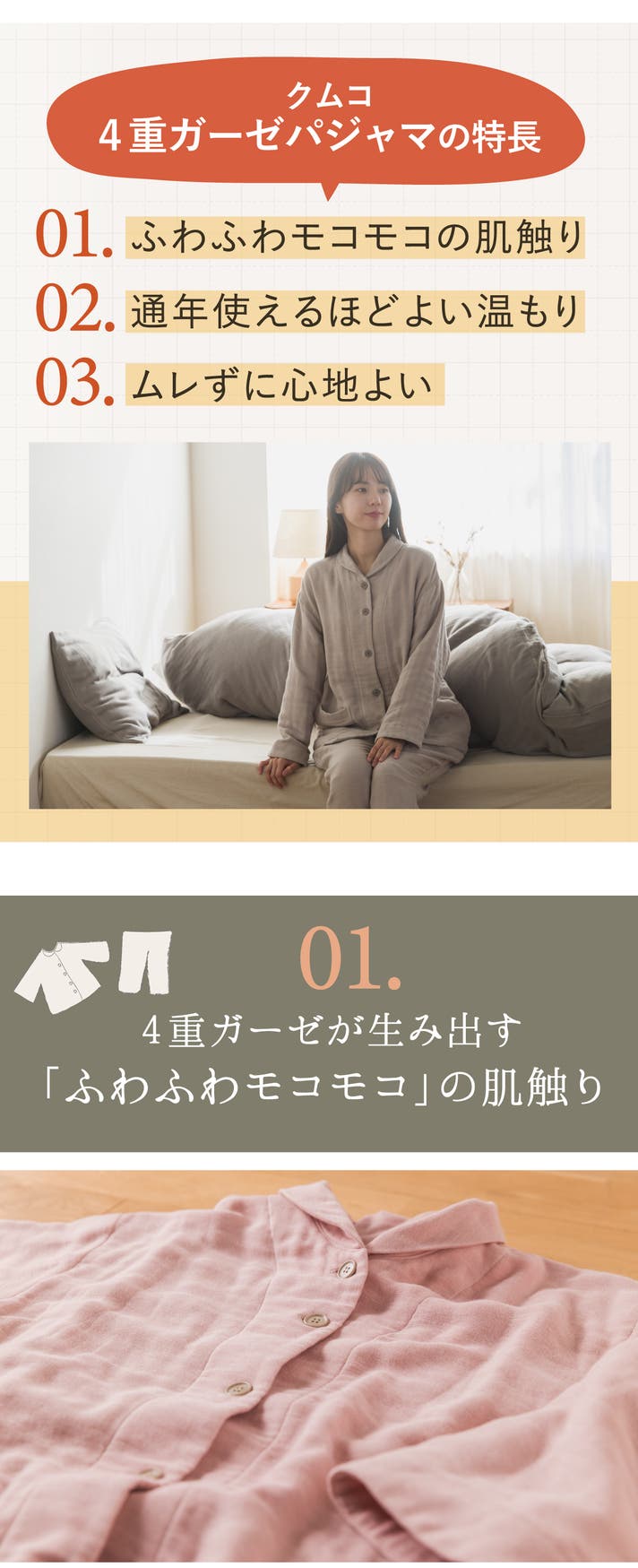 クムコの4重ガーゼパジャマは、天然コットン100%で肌に優しく、静電気が起きにくい。