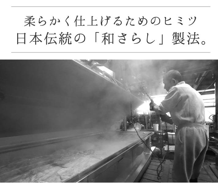 約40分で仕上げる一般的な「洋さらし」と違い、「和さらし」加工は4日間天然水に漬け込み、繊維にストレスを与えないようじっくり仕上げるので、繊維が持つ丸みを壊すことなく、ふっくら柔らかく仕上がります。