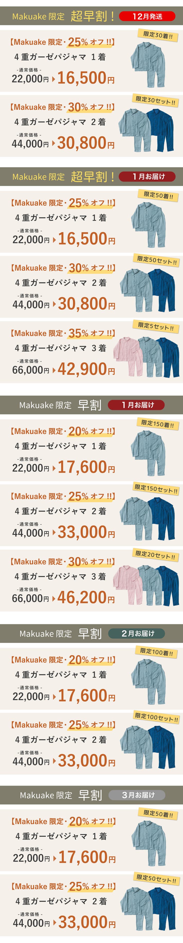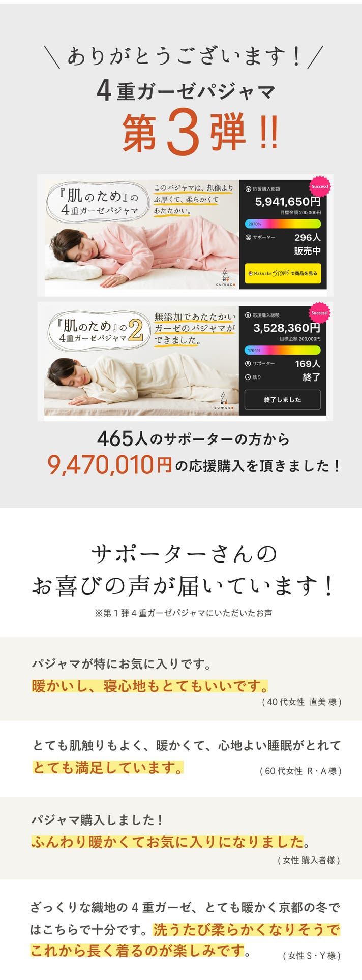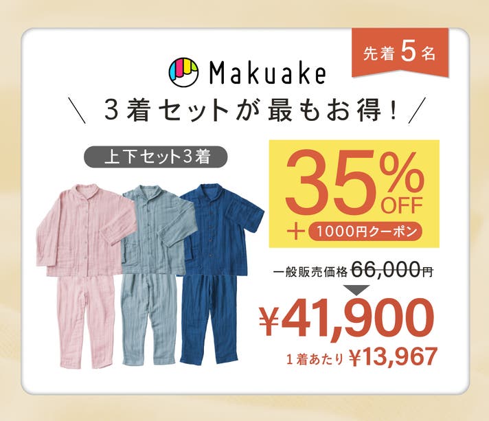「Makuake(マクアケ)」は、実行者の想いを応援購入によって実現するアタラシイものやサービスのプラットフォームです。このページは、 プロダクトカテゴリの 「【第3弾】肌に優しい天然素材。寝具屋が作った肌に優しい4重ガーゼパジャマ。」プロジェクト詳細ページです。