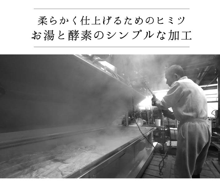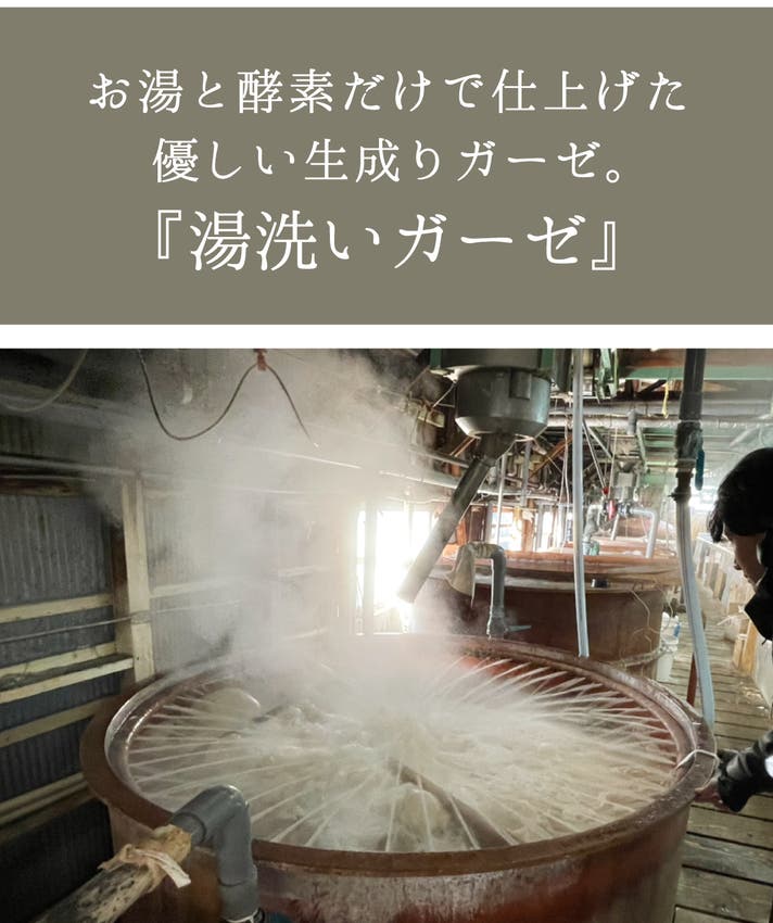 通常「さらし」は、塩素や過酸化水素水を使って汚れと色を落としますが、『お湯と酵素のガーゼ』は「お湯」と糊を落とすための「酵素で出来た糊抜き剤」だけを使い、より繊維に負担をかけずに仕上げました。