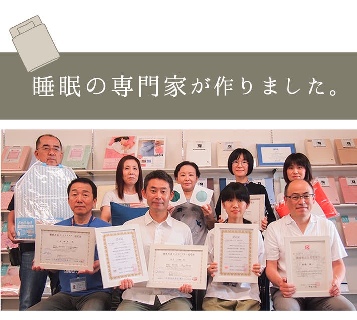 私たち「おもてなしねむり研究所」は、お客様に的確なご提案・アドバイスができるよう、睡眠環境・寝具指導士、睡眠改善インストラクター、繊維製品品質管理士(TES)など、睡眠や寝具、繊維に関する資格を保有しています。