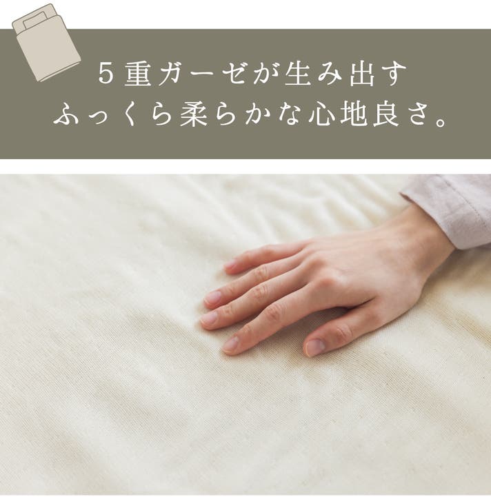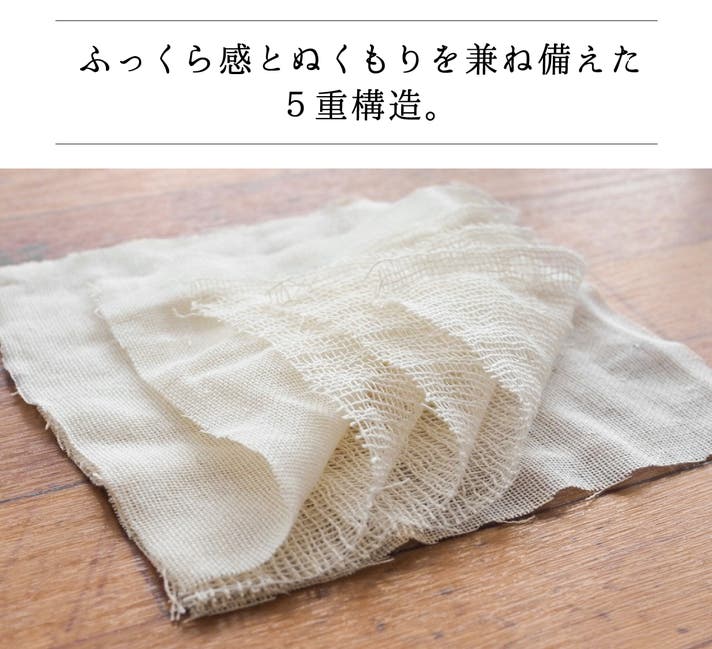 5枚のガーゼを優しく重なるように織り上げています。“内側を太い糸で粗く織る”ことでふっくらとしたボリュームが生まれ、よりたくさん空気を含む構造になりました。