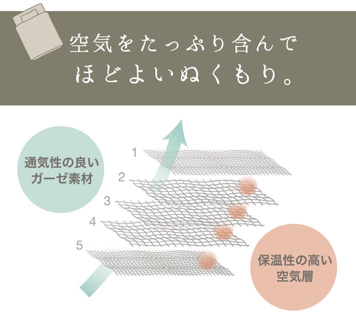 5枚重ねたガーゼの間に空気をたっぷり含むから、体から発する熱をため込む保温力が高い。天然素材のガーゼで自然なあたたかさです。