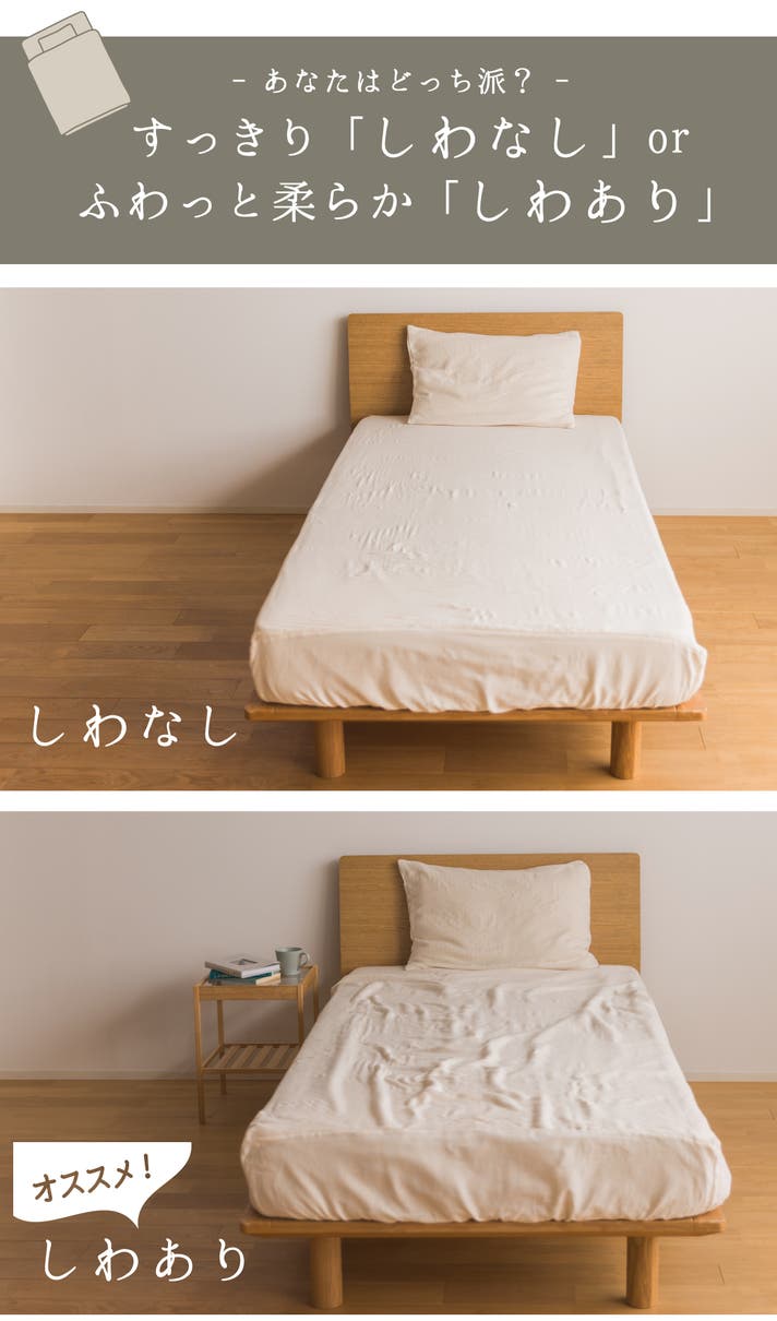 クムコのシーツは、すっきりときれいにセットする「しわなし」、ふわっと柔らかくセットする「しわあり」、どちらでもお好きなセッティングを楽しめます。